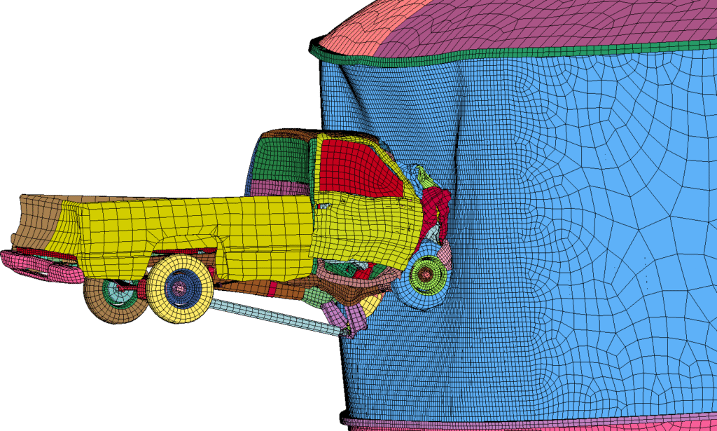 We reverse engineered the tank, and developed a Finite Element Model. A battery of missile impacts was evaluated, including the impact of a ¾ ton Chevy Pickup Truck. The pickup truck was modeled to closely resemble the automobile described in Regulatory Guide 1.76 Rev. 1.