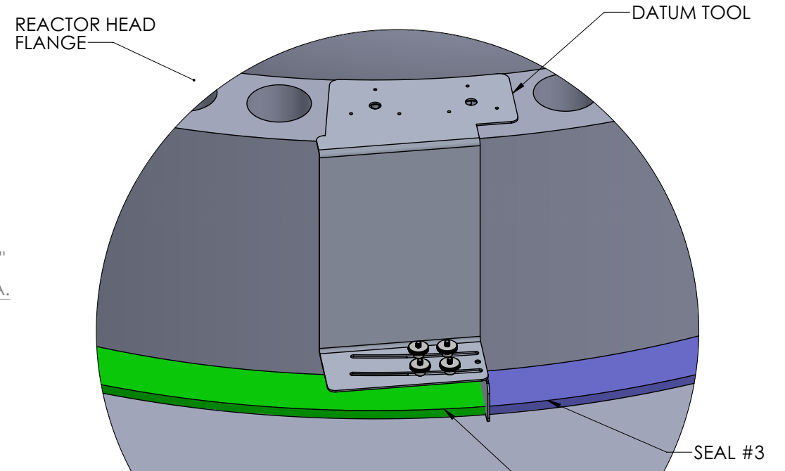 XCEED’s Reactor Cavity Seal Datum Tool assists workers with the initial placement of the 3-piece reactor cavity seal (shown in blue). Workers must align the seal with a consistent starting point around the flange as seal segments are installed. To achieve this, the tool interfaces with two existing flange stud holes and provides a hard-stop for crews to begin deployment of the seal.
