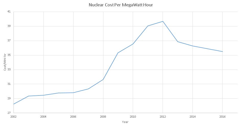 Since the peak cost per Megawatt in 2012 of $39.69/MW-hr, the Nuclear Industry has saved about 11%, down to approximately $35.48/MW-hr in 2016. That much activity doesn’t simply happen without a concerted effort. The industry is moving in the right direction, and gaining momentum.