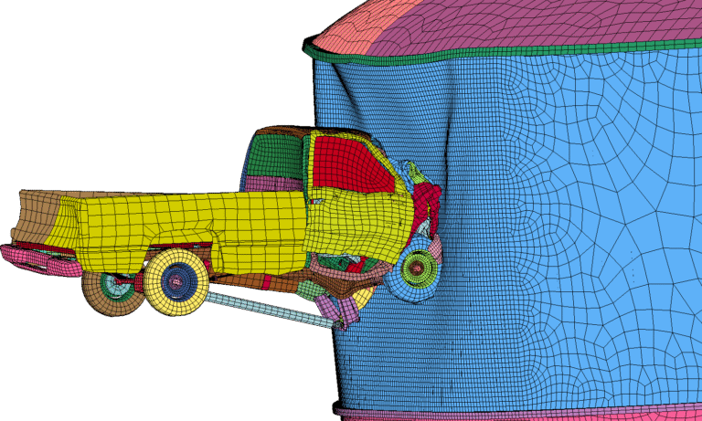 We found that API-650 tanks are more robust than most expect. The water in this tank absorbed 30% of the energy of a truck going 93 mph!