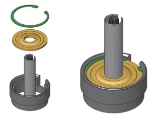 That next turn you make in your car may very well depend on a retaining ring. The main body of this E-steering assembly was held in place by a bulky cover and bolts. The engineers redesigned it to eliminate these costly items and replaced it with a beveled retaining ring, another variation of a standard retaining ring. This ring features a 15-deg. angle on the outer edge and a complementary angle on the groove wall. When installed, the ring wedges itself between the groove and the retained part, eliminating endplay and vibration.